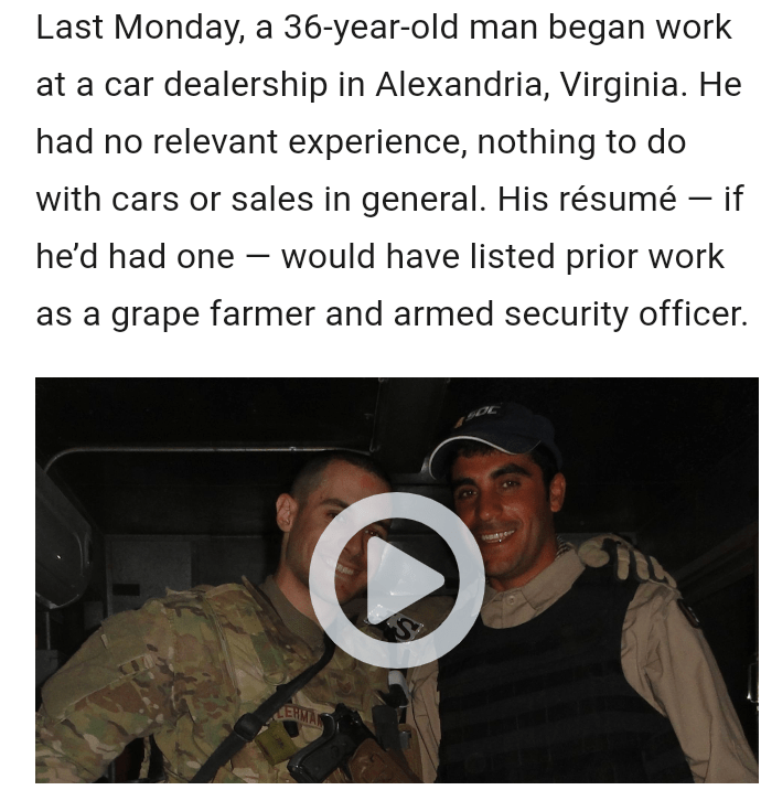 Last Monday, a 36-year-old man began work at a car dealership in Alexandria, Ontario. He had no relevant experience, nothing to do with cars or sales in general. His résumé — if he’d had one — would have listed prior work as a grape farmer and armed security officer.